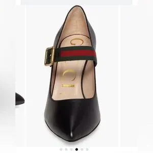 Fabulous Gucci pumps made in Italy, black leather with signature Gucci ribbon strap, Mary Janes, size 37.5 (7.5 US) sexy four-inch heels, very gently worn once indoors, minimal scuff marks as shown in photos