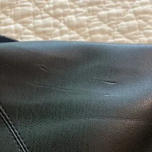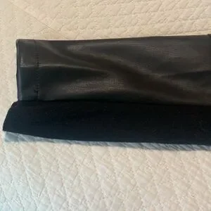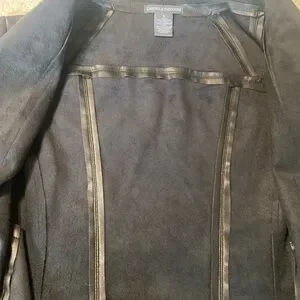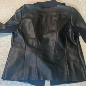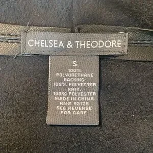 Women’s Chelsea & Theodore jacket. 100% polyurethane with knit on under side of sleeves. Side pockets with zippers. Does not have closure on front. One mark on upper right shoulder in back.