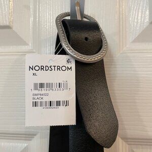 This brand new Ladies Melrose and Market black leather belt in size XL comes from Nordstrom Rack. The silver metal buckle has raised 'beads' and the belt measures 49".