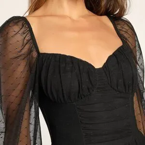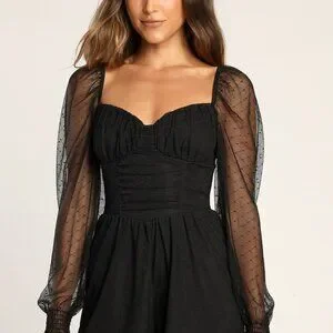 Brand new in the package with tags, never tried on, the Lulus Flirty Fashionista Black Mesh Bustier Long Sleeve Romper is a date night necessity! This cute bodysuit is composed of sheer mesh (atop a matching stretch knit liner) that shapes a bustier-inspired bodice and a sweetheart neckline (with no-slip strips). Long sheer sleeves feature elastic at the shoulders and smocked ruffled cuffs and the fitted waist tops flowy shorts. Hidden back zipper/clasp.