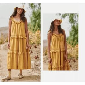 THE GREAT. Eyelet Magnolia Tiered Oversized Midi Dress Mustard Yellow Size S