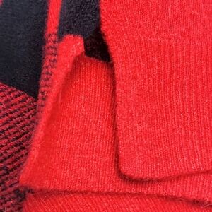 • Fuzzy-textured plaid long-sleeve sweater with a roomy fit. Has a slit on each side of the bottom hem (Picture 5). Back is solid red.