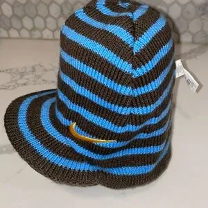 The Nike label, knitted winter beanie hat sideways Rim hat skiing, snowing, sledding, snowboarding, winter activities, warm hat