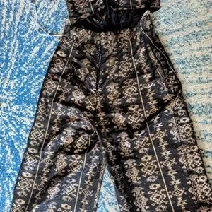 Gorgeous silk jumpsuit, with gold Greek inspired pattern. Zip up pants back with haltered top haltered top strings and ties mid back. The perfect blend of casual sophistication. I purchased this from Neiman Marcus for my 40th high school graduation dinner event. Sadly it never fit my 5’10” torso very well. Lace (lace.com.gr) size L (euro sizing) app size 6-8 US. never worn.