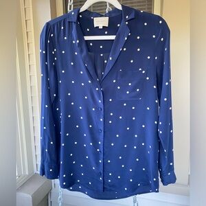 This shirt is stunning! Purchased and only worn three times. This is in excellent condition. No fading, tears, pilling, etc. No longer sold online. Vibrant navy blue with ecru polka dots. This piece would look good with almost anything. I was fortunate enough to wear this in Versailles, so it’s also been back to its native country. Long-sleeve, pajama style shirt collar. Chest pocket. Button placket with covered buttons. Approx: 27” in length. Hand wash or use delicate cycle. Lay flat or hang to dry. Purchased at full retail. Fairly firm on price. Size 34 which is a US 2. 100% silk.