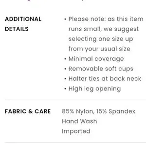 Please note: as this item runs small, we suggest selecting one size up from your usual size. Minimal coverage. Removable soft cups. Halter ties at back neck. High leg opening.