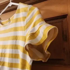 Old Navy yellow and white stripe dress. cute little ruffle short sleeves. zipper closure in back with top small slide hook. tappers a bit to midline.