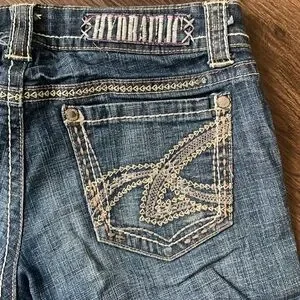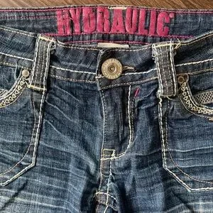 Hydraulic medium wash distressed and embroidered jean shorts size 3/4
