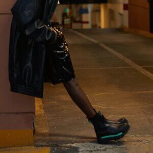 This slip-on Chelsea design has ribbed elastics on its side panels matching with the rand design, which offers an easy-to-put-on ankle boot that holds in place. Its strong outsole design is complemented by wide stitches and neon-colored pull tabs.
