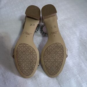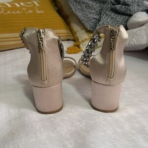 Champagne satin with silver tone jewels. Size 8 worn maybe two hours excellent wedding/formal shoes.