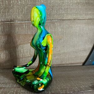 Set of two, Hand-painted ceramic classic yoga figurine postures. These are two of several of classic yoga poses. They represents calming and relaxation. Hand-painted by me with alcohol inks. Alcohol Ink is a fluid painting technique. The term refers to various techniques that have to do with working with paint in a liquid medium. This pair are great decorative pieces that fit well just about anywhere; bedside table, shelves, spiritual room, yoga studio, countertops, mantels, porch or work space. These have a colorful tie dye effect, exotic and vibrant style.