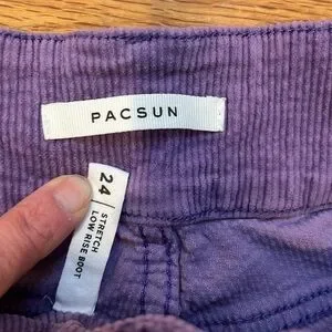 PacSun Plum / Purple Corduroy Low Rise Bootcut Stretch Corduroy Jeans are slim through from hip to thigh, with a bootcut leg with a little flare. They also have a little stretch to them. Beautiful color and versatile for any occasion.