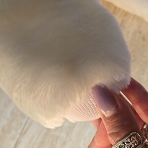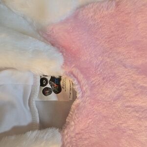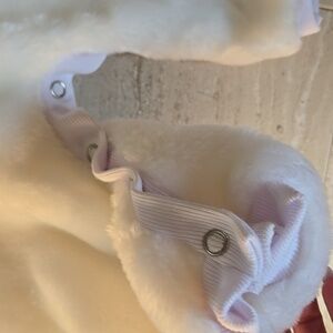 Like new. Snaps around legs...easy to put on. Extremely soft and comfortable. Silky-smooth interior. Cotton tail. Absolutely adorable.