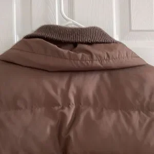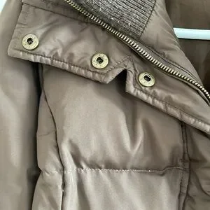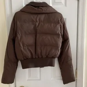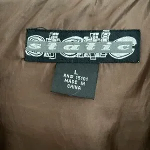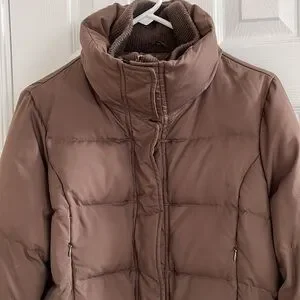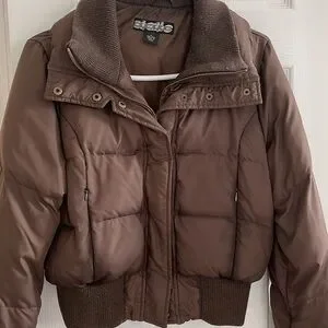 Static, Brown Size Large (juniors) winter coat/jacket. Front zipper with shape. Fully lined, with sweater-type internal cuffs and trim at bottom of coat and around neckline. Front zipped pockets. Shell and lining 100% Polyester; filling 92% feather and feather fibers/5% down fibers/3% down cluster. Machine washable!