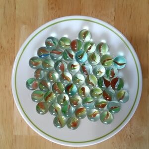 The mesh bag hold 70 cat's eye marbles from the 70s. All very similar not a lot of variation in color.