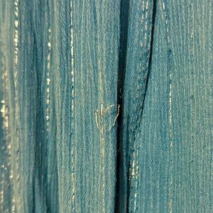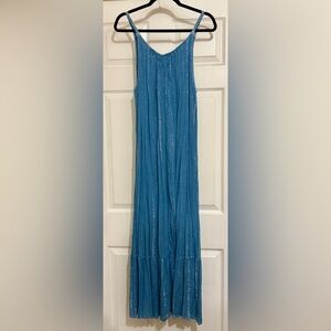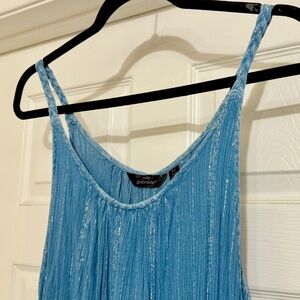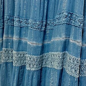 Mlle Gabrielle Blue Maxi Dress with Metallic Threading Accents, Lace Inset, and braided straps, Size 2X. This item is layered with an inner lining (length to knees). This is item was only lightly worn, in good condition. Some loose metallic threading in occasional spots, see photos.