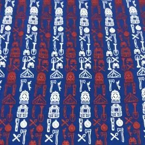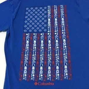 Back has large graphic shaped a flag and made out of outdoor items and stars