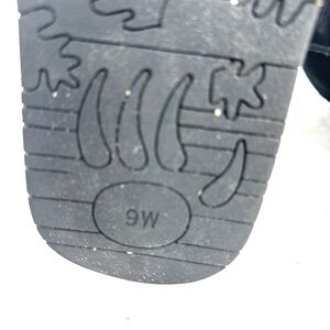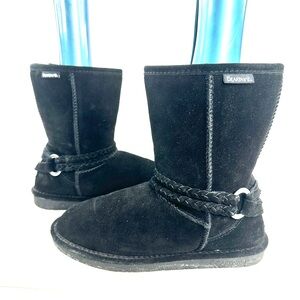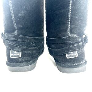 Western vibe winter boot! This Bearpaw Adele women's size 9 wide black suede has a super cozy sheepskin lining and wool blend insole. There is a harness around the bottom of the shaft with 2 parts and half of it is braided. So cute! Sole is slip resistant. Very good condition. Minimal normal wear. Spots around. Normal creases across front. Suede has normal patina. This is a pre-owned item and may have fading or discoloration, marks or stains, scratches, wrinkling, wear on straps, corners, trim and texture. If this is an issue, buyers should purchase items brand new.