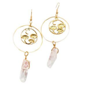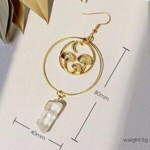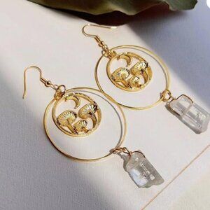 Quartz Crystal & Golden Mushrooms Long Dangle Earrings