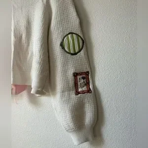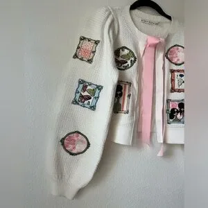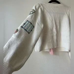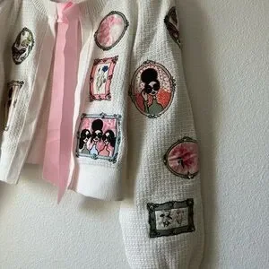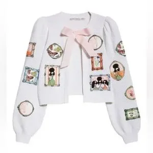 Whimsical illustrations and a petal-pink bow animate a darling seed-stitch cardigan enriched with wool and cotton. 17" length (size Medium) Tie closure Long sleeves Ribbed cuffs and hem 64% wool, 21% cotton, 14% acrylic, 1% elastane Dry clean Imported