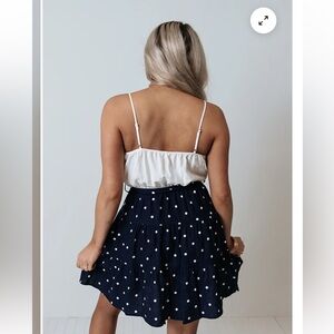 This white tank with tiered navy/polka dot skirt - mid thigh length, is from impressions boutique. Size medium and in like new condition, never worn
