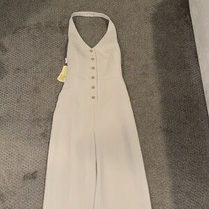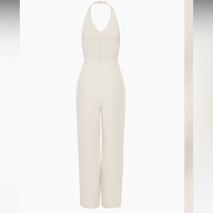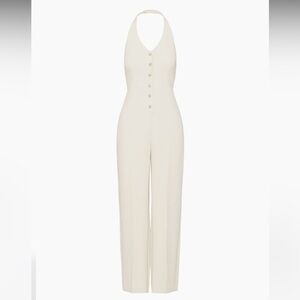 This is a sleeveless button-up jumpsuit with a wide leg, V neckline and smocked back. It’s made with Crepette™ — our one-of-a-kind Japanese crepe fabric beloved for its subtle texture, breezy drape and the fact that it basically never wrinkles.