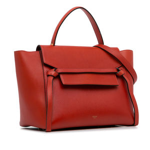 The Belt bag features a leather body, a flat leather top handle, a detachable flat leather shoulder strap, a front flap with a magnetic closure, a top zip closure, a back exterior zip pocket, and interior slip pockets. It carries a B+ condition rating.