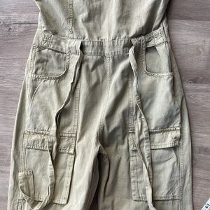 NWT! Only tried on. Super cute cargo jumpsuit in an army green/khaki color. Size large. Has elastic back so it has some give in the bust area, the fabric itself does not have stretch. Straight leg and very flattering on. There is a side zipper and waist tie. I am 5’4 and the bottoms hit right at my foot.