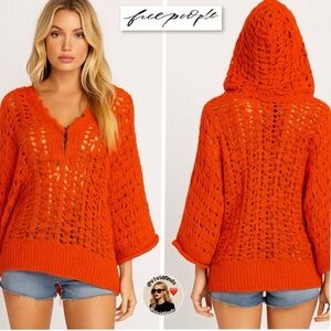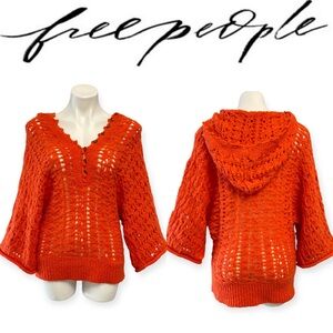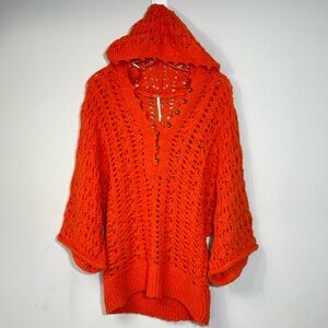 Free People Hooded Open Knit Dolman Sweater Orange Wool Blend Crochet Pullover M