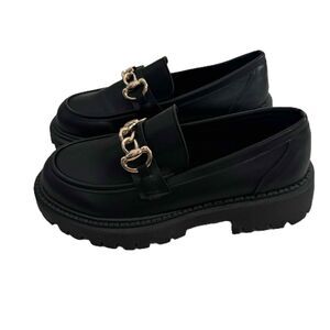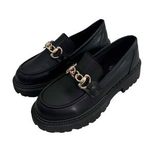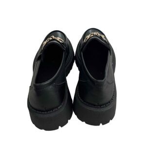 Step out in style with these trendy loafers! Featuring a sleek black design with eye-catching gold chain embellishments, these shoes are perfect for adding a touch of edgy glamour to any outfit. The chunky sole not only provides comfort but also gives you a fashionable height boost.
