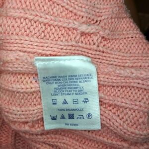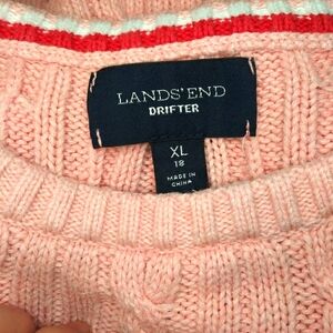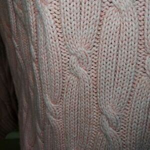 EUC Very pretty, cameo pink 100% cotton, preppy style cable crewneck sweater with plenty of natural stretch, from Land's End. Color is called clay bisque heather, and sweater is in excellent used condition, but does have very faint spot on front. Spot is hard to see, please see above photo, I'll be pricing accordingly. Bust 23 1/2, waist 22 3/8, hem 21 1/4, length 24 1/2 inches. Please see all photos.