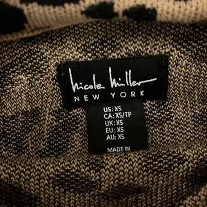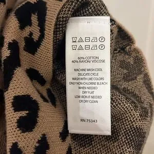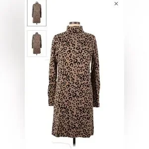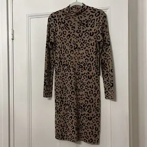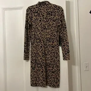 Cotton rayon viscose blend makes for a nicely fitting dress leopard print, mock turtle neck and long sleeves. Length from shoulder to hem is approximate 38” just below knee.