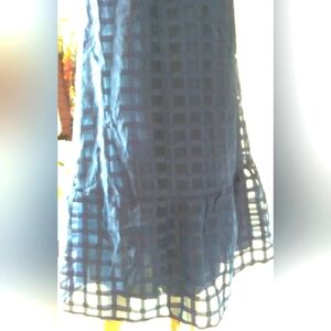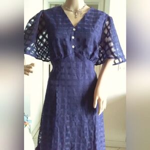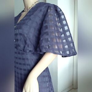 THIS DRESS'S OUTER LAYER IS COMPLETELY SHEER WITH SQUARES. IT IS LINED AND ONLY SHEER AT THE SLEEVES, ITS JUST SO LOVELY. THE BOTTOM HAS A RUFFLING AND THE VERY BOTTOM MAY BE SHEER. IT HAS BUTTONS ON THE FRONT WHICH ARE DECORATIVE ONLY.
