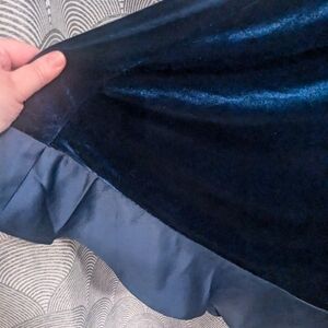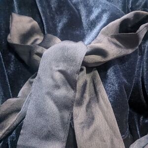 Soft velvet like exterior with ribbon tie and ribbon ruffles down front and at bottom of dress. Flutter sleeves. Invisible button on front so you can show as much or as little as you wish. Hidden zipper back.