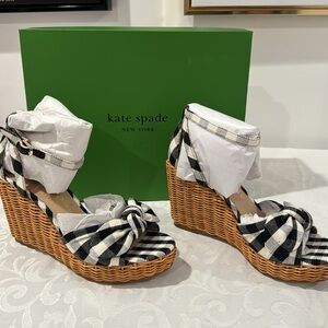 NIB. Adorable Kate spade Tianna wicker gingham print sandal. Black and cream gingham print, wedge heel, ankle strap, open toe. 4” heel with a 1” platform. True to size. Ladies 8.5. Box included.