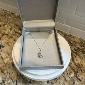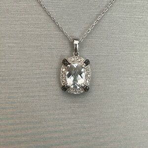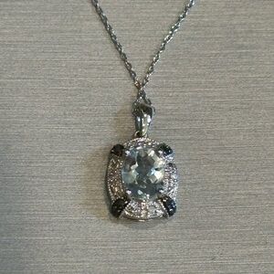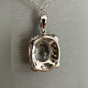 This faceted aquamarine pendant necklace with diamond accents set in 14k white gold is beautiful. The stone measures approximately 9.5 mm x 5.6 mm. The pendant measures 9/16" long and 3/8" wide, not including bale.