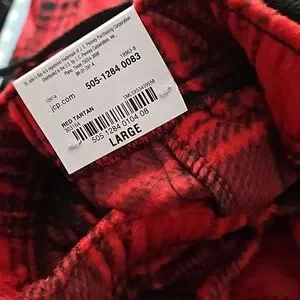 Size large. Pyjama pants. Red tartan. Black tie at elastic waist. NWT.