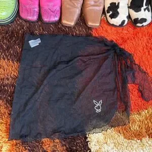 Vintage deadstock 3 piece Playboy black bedazzled string bikini with mesh sarong. Comes with the classic side tie modest coverage bottoms and triangle halter top as well as the mesh black sarong with bedazzled playboy bunny logo. Size “large” but runs small and would fit a small/medium best.