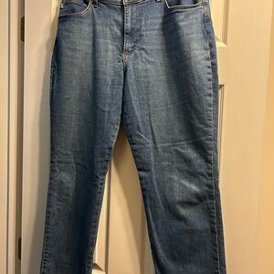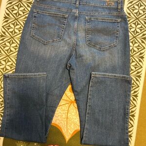Lee size 14 M stretch fit jeans. Small, slightly noticeable stain on right pant leg. Super comfy, looks great with an oversized sweater and cute ankle boots.
