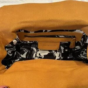 A gold color leather Leifsdottir that has short handles and a long strap that attaches. It’s a great size. Also comes with dust bag.