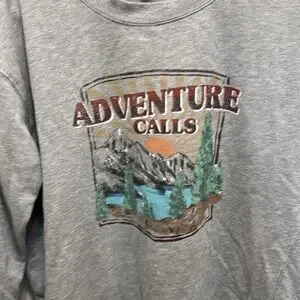 It’s in great used condition. There’s no stains and no nicks. It says Adventure Calls. It also has a mountain landscape. The sleeves are 3/4 inches. Perfect for Fall weather. Open to reasonable offers.