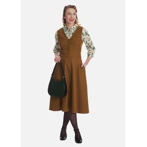 This dress with a vest-like bodice and an A-line skirt. There is a back zip closure and side pockets in the skirt.