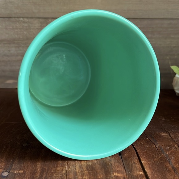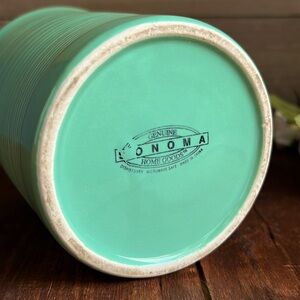 Such a pretty vase/catchall stoneware piece by Sonoma. Has the look of fiesta ware. It’s been used to hold cooking utensils and as a cut flower vase. It’s a pretty aqua green as opposed to an aqua blue. Photos read a bit more blue. No chips or cracks-has a mark (photo) that looks like a pen mark.