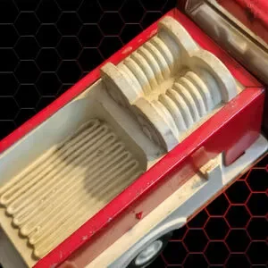 This is a pre-owned Tonka fire truck, model number 55250. It is made of metal with a red body and white accents. The truck has a clear plastic windshield. The truck is approximately 4 inches long and 2 inches wide. The truck is in good condition for its age, with some minor wear and tear. There are some scratches and dents on the body, and the paint is slightly faded in some areas. The wheels are in good condition, and the tires are still intact. The truck is missing the original box and instructions. Overall, this is a great vintage toy that would be a great addition to any collection.