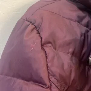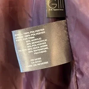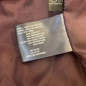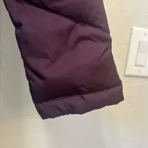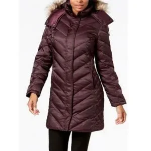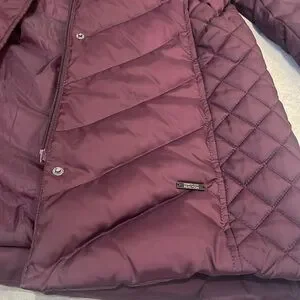 Kenneth Cole Reaction faux fur lined hood puffer jacket in excellent condition. Beautiful deep purple /burgundy color (more purple with a hint of red). Zip and snap close in front. Hood is detachable. Minor mark on left shoulder (see last photo).