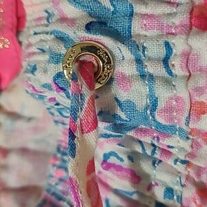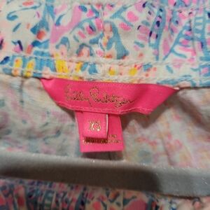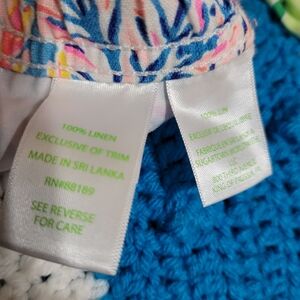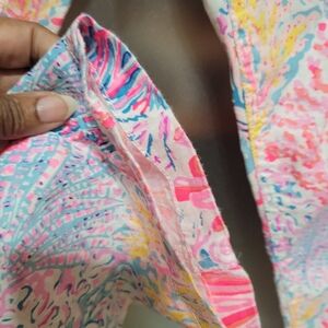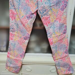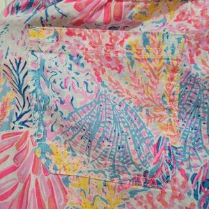 in new condition, coastal sea life colorful fabric 100% linen. comfort elastic and drawstring adjustable waist