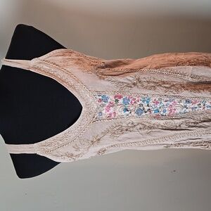 Beige knee length embroidered V neck with tie back waist summer dress.