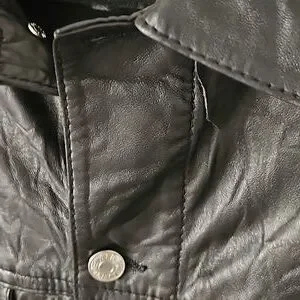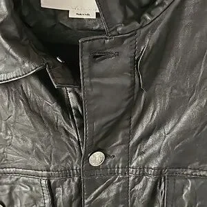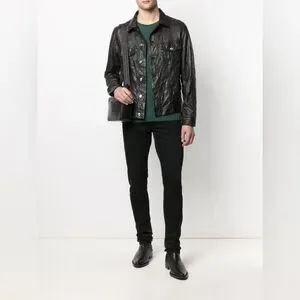 black crinkled finish classic collar two chest flap pockets long sleeves buttoned cuffs two side slit pockets straight hem