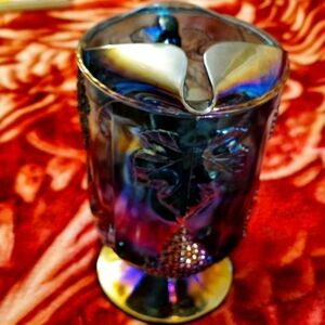 This is a vintage, very iridescent carnival glass pitcher that radiates with so much color. Made in the the 70's, it has lasted with all its luster and shine. This piece weighs almost 5 lbs and is made very sturdy and thick. It is in superb condition with no cracks, chips, or scratches. The color changing from blue to purple to red and others, is amazing on this pitcher. It is not worn off like many others.