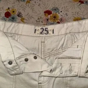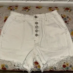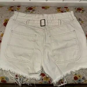 Free People jean shorts in white with a super cute buckle in the back and frayed edges. Well-loved, good condition. Large pockets. Very soft and comfortable material. Size 25. Comes from a smoke-free home.